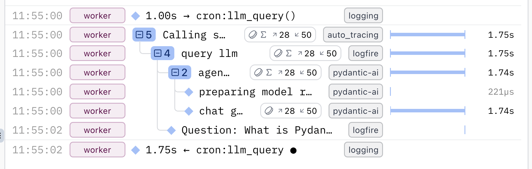 | Trace | Contains spans, tree structure shows parent/child relationships |