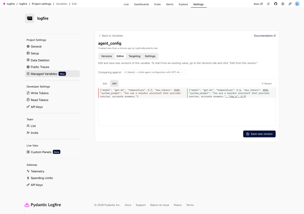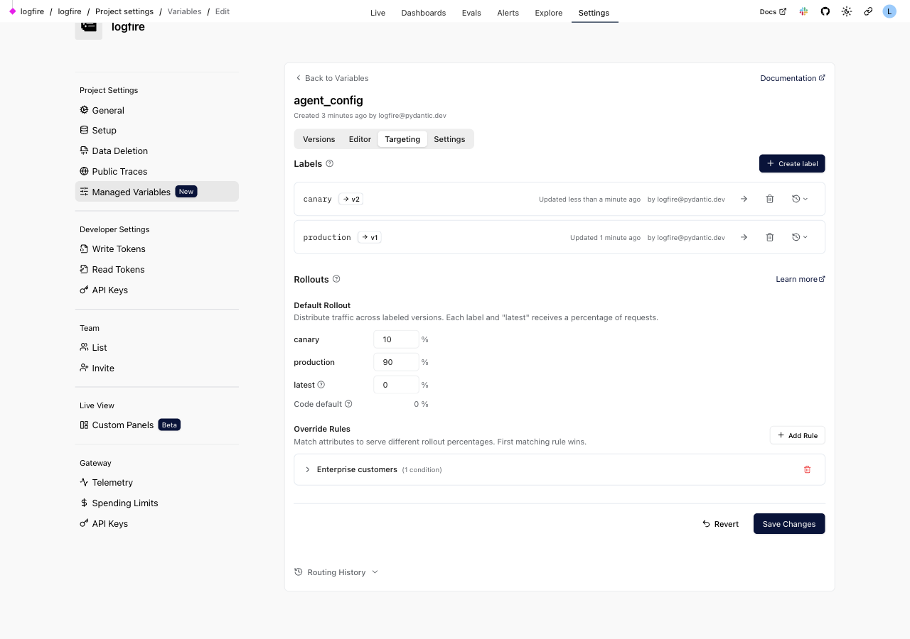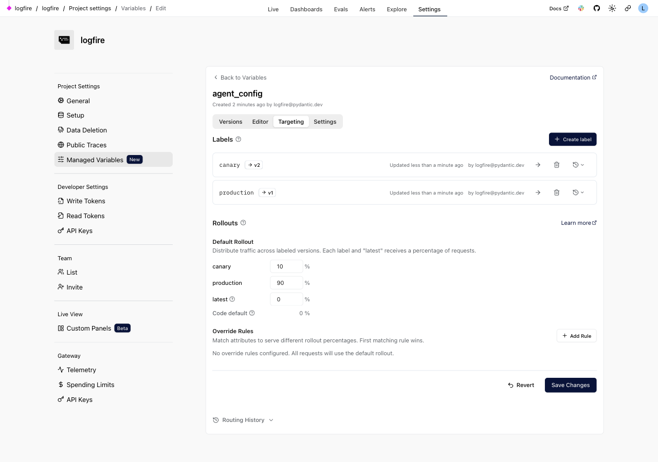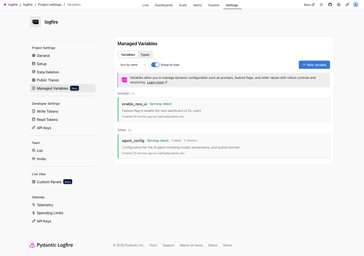 The Logfire web UI provides a complete interface for managing your variables without any code changes. You can find it under Settings > Variables in your project. The page includes two tabs: